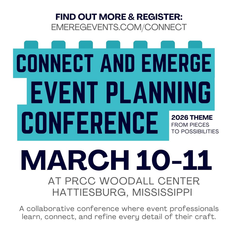 Join us in Hattiesburg for the Connect & Emerge Event Planning Conference! This event will connect the local and regional event planning community, share information, and showcase event resources. By the end of this conference you will leave with more connections, information, and tools to create the most successful events possible.