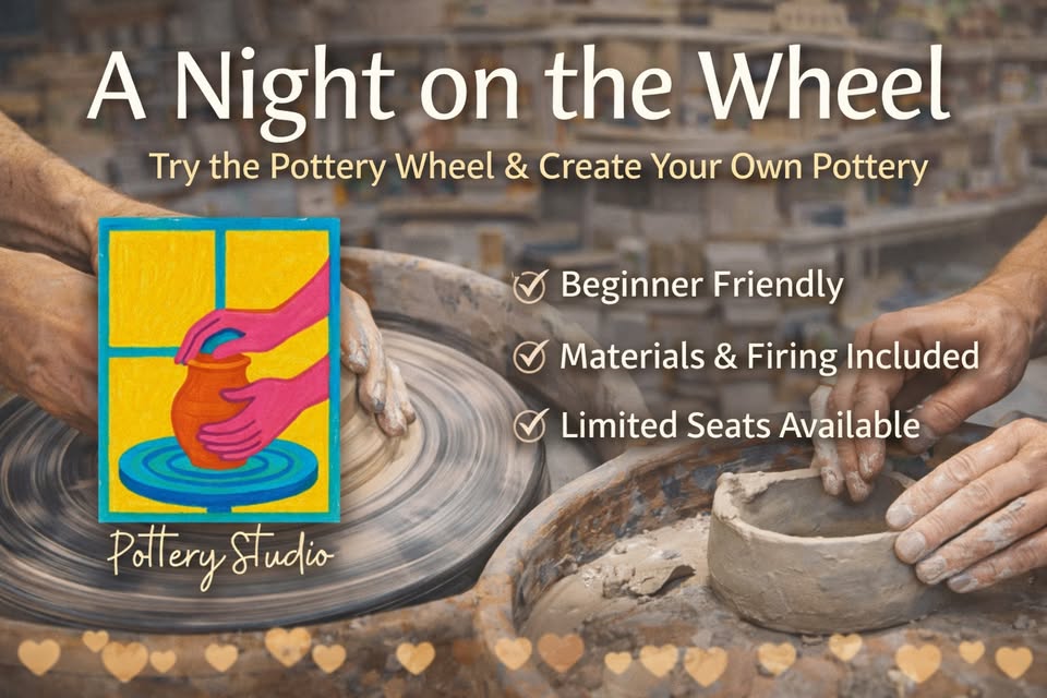 Try the pottery wheel and create your own handmade piece in this beginner-friendly class at The Wheel in the Window Pottery Studio. This hands-on session is perfect for anyone who’s curious about pottery or wants a creative, relaxing experience.