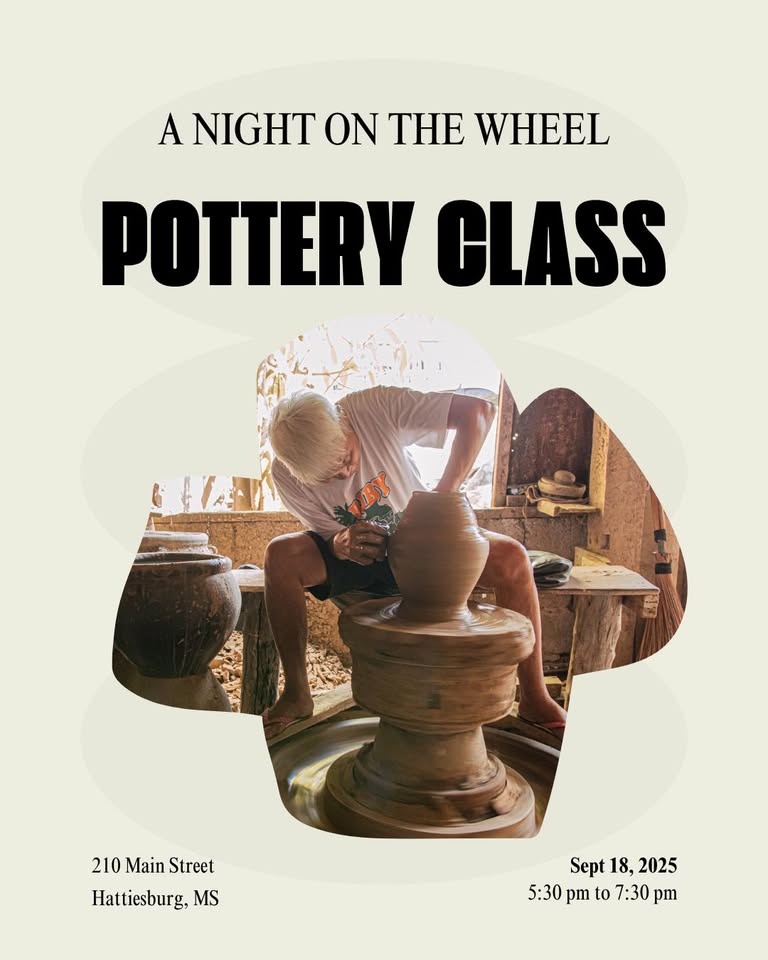 Ready to get your hands dirty and your creativity flowing? Join us for a night on the wheel where you’ll mold Mississippi magic with mindful making! Whether you’re a complete beginner or rediscovering your artistic side, this class is perfect for unlocking your creative potential and crafting a lasting memory.