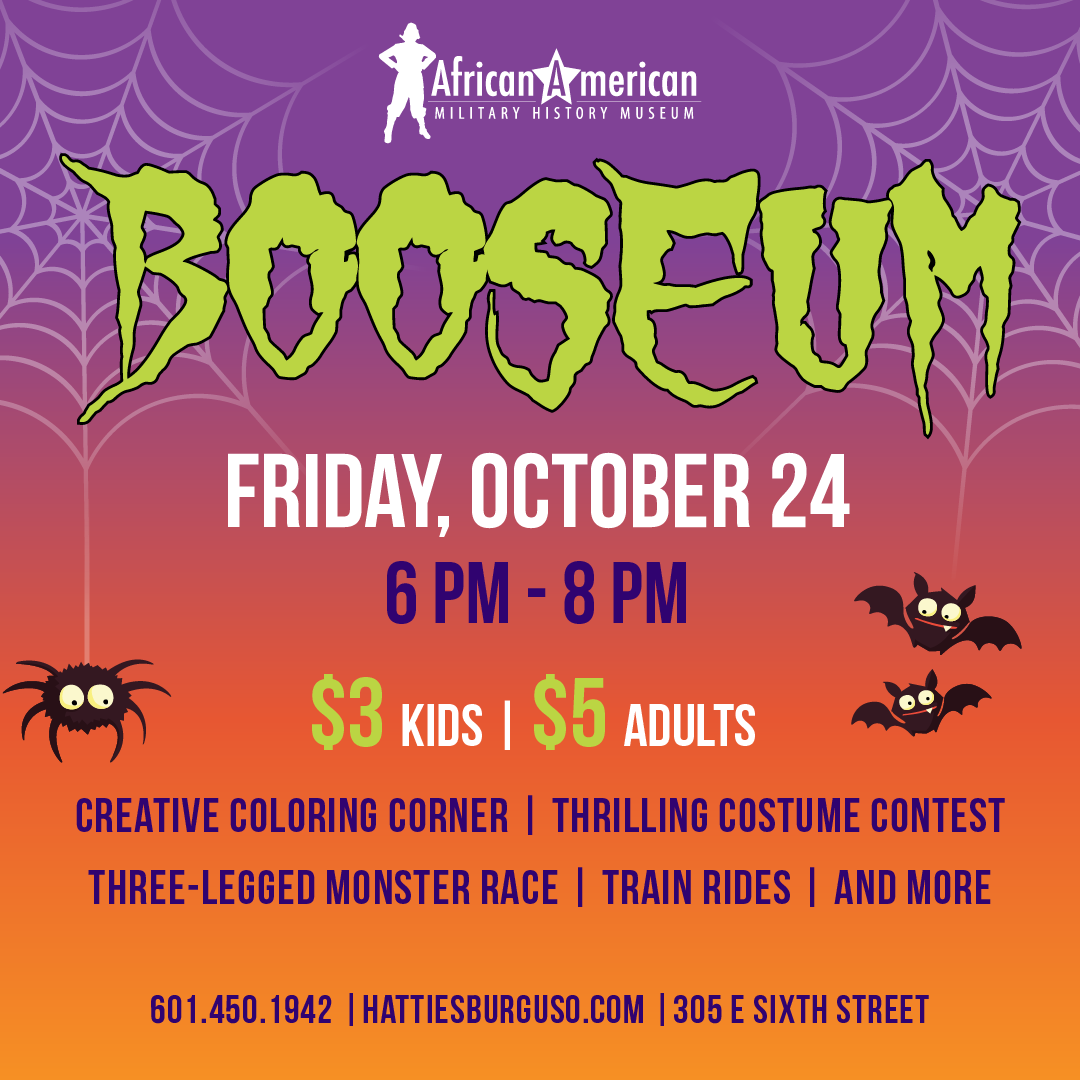The African American Military History Museum (AAMHM) will host its annual “Booseum” event, a family-friendly Halloween celebration, on Thursday, October 24, 2025, from 6:00 PM to 8:00 PM. This exciting evening promises a safe and engaging environment for children and adults alike to enjoy the spooky season. Attendees can look forward to a variety of exciting activities, including a creative coloring corner, a thrilling costume contest, a trick or treat tour, a fun three-legged monster race, and more. For the first time ever, the Booseum event will also feature train rides, adding a unique and memorable experience for all participants. Admission to the Booseum event is $5 for adults and $3 for children. The African American Military History Museum is located at 105 E. 6th St., Hattiesburg, MS 39401. For more information, call 601.450.1942, email usomuseum@hattiesburg.org or visit hattiesburguso.com.
