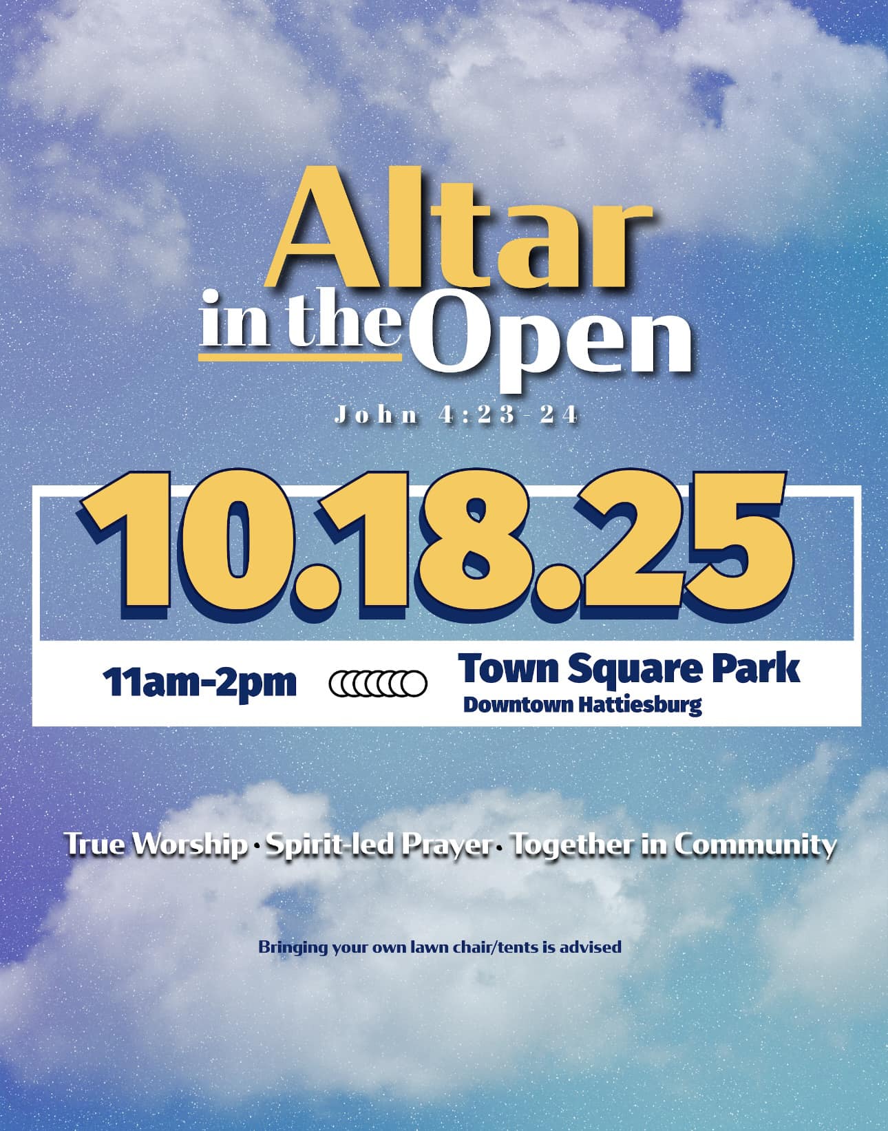 Altar in the Open is a citywide gathering hosted in Hattiesburg, Mississippi. It’s a public event centered on prayer, worship, and seeking God’s presence together, designed to encourage unity, hope, and peace in the community. The event will take place on Saturday, October 18, 2025, from 11:00 am to 2:00 pm at Town Square Park. The purpose of Altar in the Open is to bring people together in an open space for collective spiritual expression and to create an atmosphere where the city can encounter God beyond church walls. Lawn Chairs and blankets are encouraged.