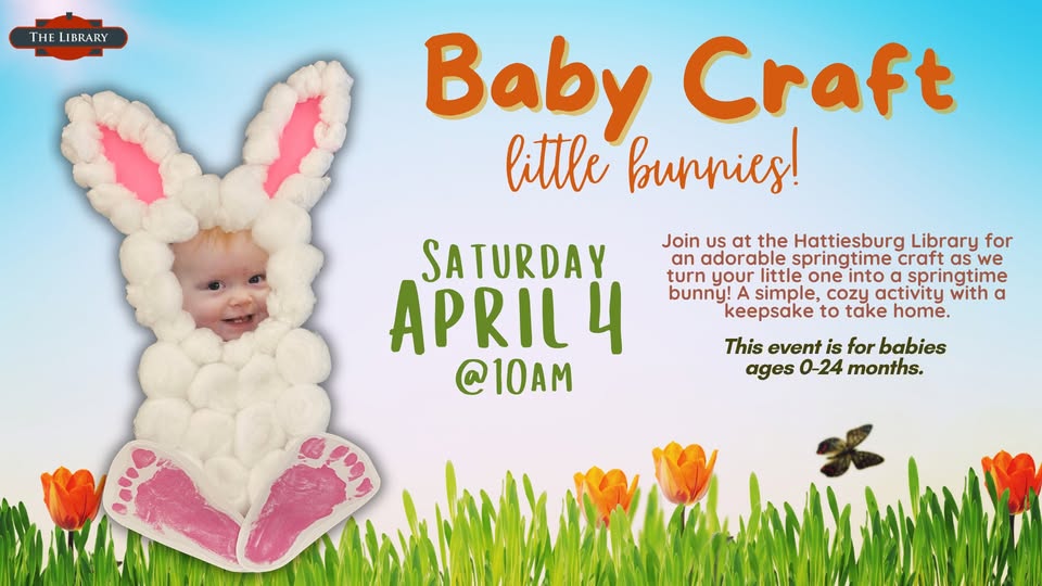 Join us at the Hattiesburg Library for an adorable springtime craft as we turn your little one into a springtime bunny! A simple, cozy activity with a keepsake to take home. This event is intended for babies ages 0-24 months.