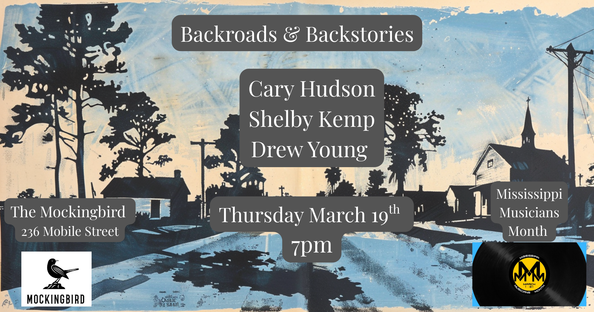 Mark your calendar for Thursday, March 19 for a night of music at The Mockingbird, with Carey Hudson, Shelby Kemp, and Drew Young.