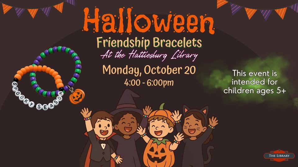 Spooky season is better with friends! Come create your own Halloween friendship bracelets to trade or keep. Choose fun charms like pumpkins, ghosts, and bats, and string them with ghoulishly colored beads for a one-of-a-kind creation. A frightfully fun craft for kids who love to create!