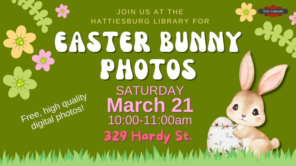 The Easter Bunny is hoppin’ on over to the Hattiesburg Library! Join us for free, high quality digital photos on Saturday, March 21st from 10:00am-11:00am.