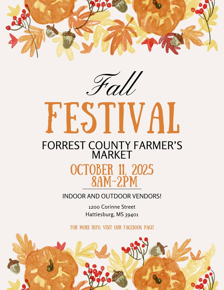 To reserve an outdoor booth, the application can be filled out and mailed to the address listed along with your fee or dropped off in person at the Forrest County Chancery Clerkโs office located at 641 N Main Street in Hattiesburg.