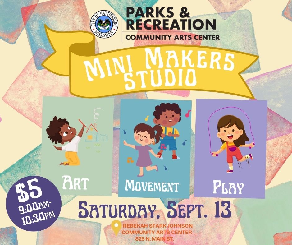 This is a City of Hattiesburg Parks and Recreation Program. Mini makers is back on September 13 for ages 5 and under with an adult! Art. Movement. Play. is our ongoing theme! Minis will Make a take-home.
