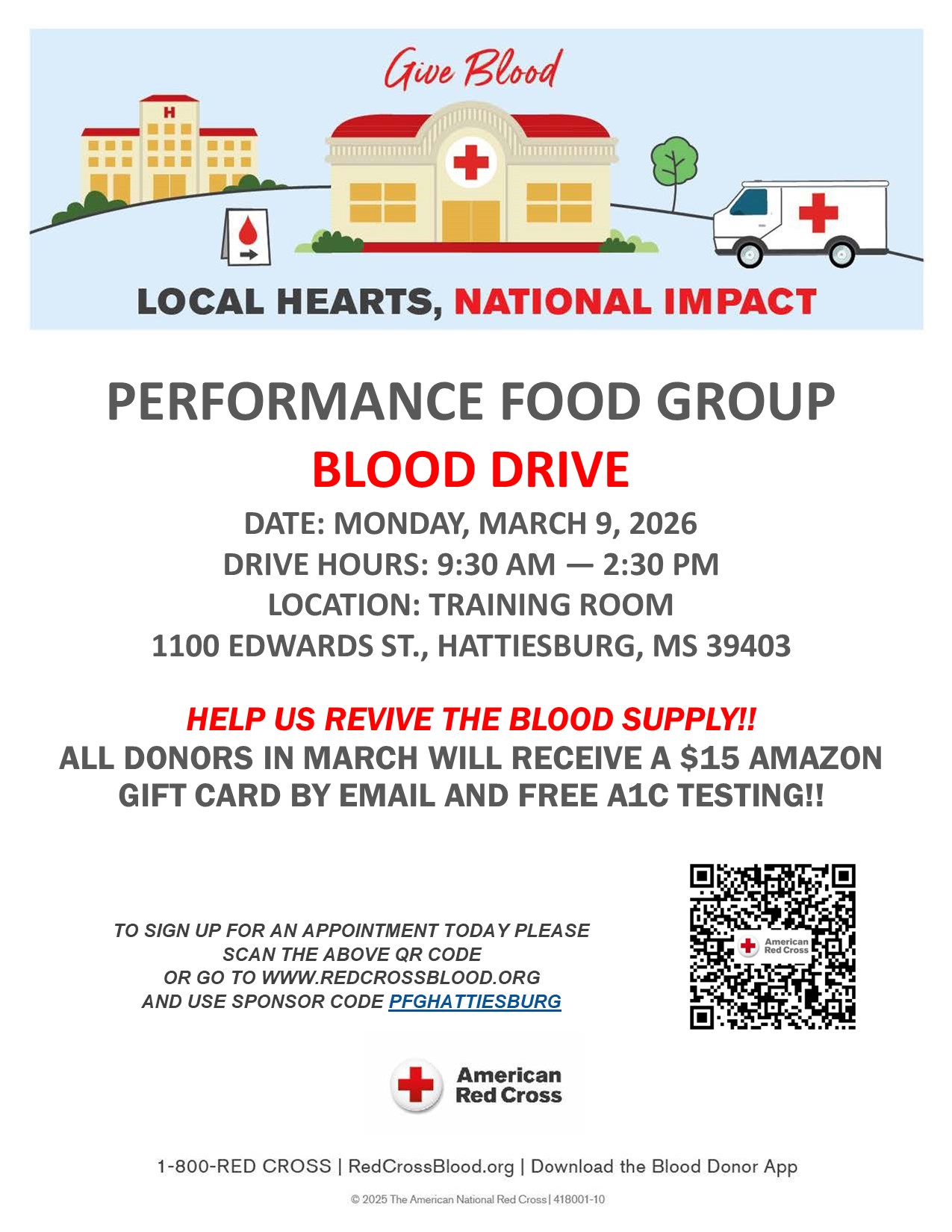 To sign up for an appointment today, please scan the QR code or go wo www.redcrossblood.org and use the sponsor code: PFGHATTIESBURG.
