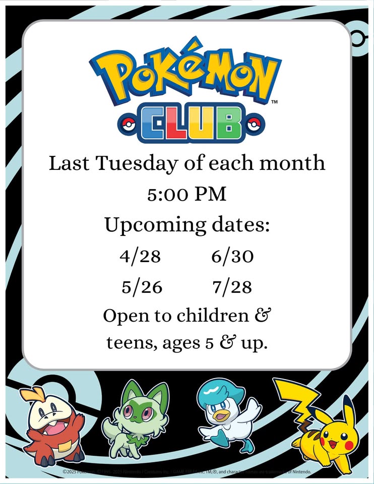 Join us to make friends while talking about Pokemon, playing the card game, and doing activities! Open to children & teens, ages 5 and up. The club meets the last Tuesday of every month at 5:00PM.