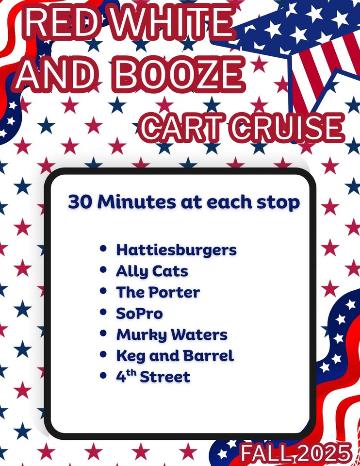 Get ready to roll out for our Veterans Day themed golf cart crawl, the Red, White & Booze Cart Cruise! Deck out your cart in red, white, and blue, grab your crew, and join us for a day full of fun, drinks, and local stops around Hattiesburg.