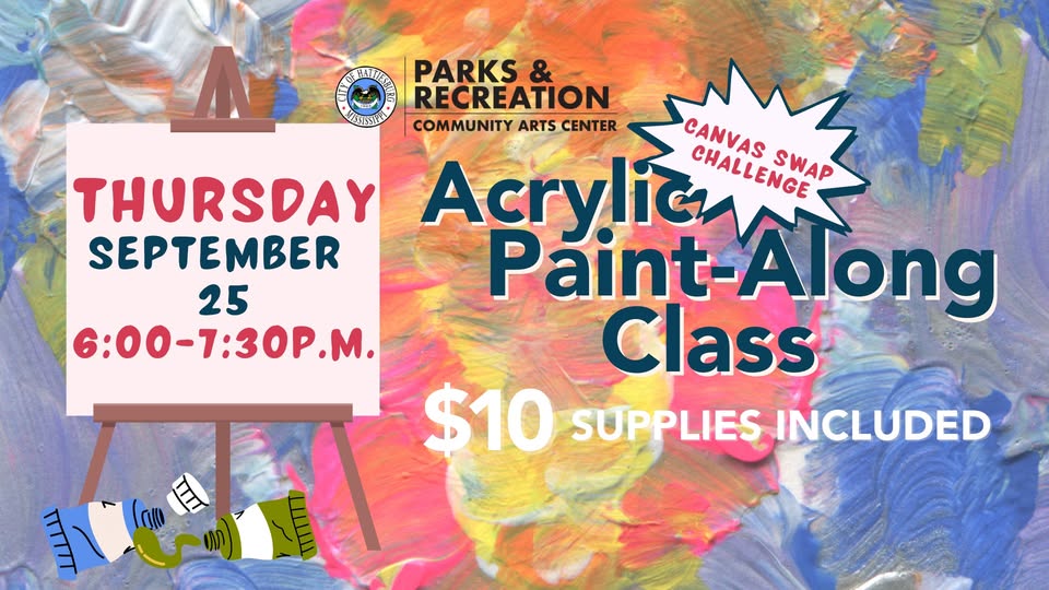 Think you can finish someone else’s happy little trees? At the Canvas Swap Paint Along on September 25th at the Community Arts Center, you’ll start by creating your own canvas, layering in skies, trees, and colors just the way you like, but here’s the twist… about halfway through, we hit pause and everyone trades canvases with a partner.