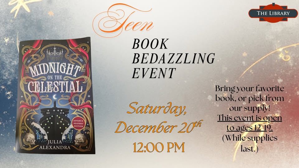 Teens, join us at the Hattiesburg Library on Saturday, December 20th at 12:00pm to bedazzle books! At the end, you get to take home a dazzling piece of art that you can read! You can either bring a favorite or select one from our supplies. This event is open to ages 12-19.