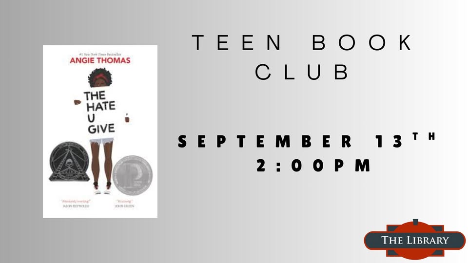 Teens, join us on Saturday, September 13th at 2:00 pm to hang out and discuss The Hate U Give by Angie Thomas.