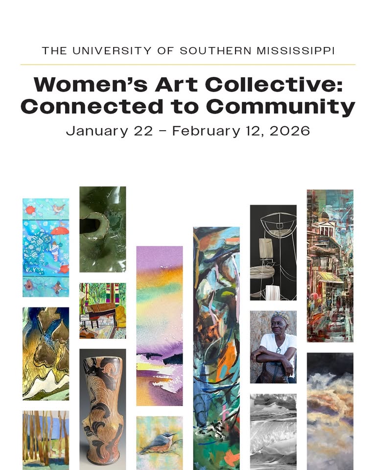 Connected to Community is a group art exhibition by the Hattiesburg Women’s Art Collective, featuring recent works by group members: Claudia Ka Cartee, Barbara-Ann Carver-Hunt, Stephanie DeArmey, Melanie Eubanks, Chatham Kemp, Rebekah Stark Johnson, Andrea Kostyal, Carolyn Norton, Diane Shepherd, Betty Press, Martina Sciolino, Susan Stevens, Traci Stover, Jennifer Torres and Kim Whitt (1952-2025).