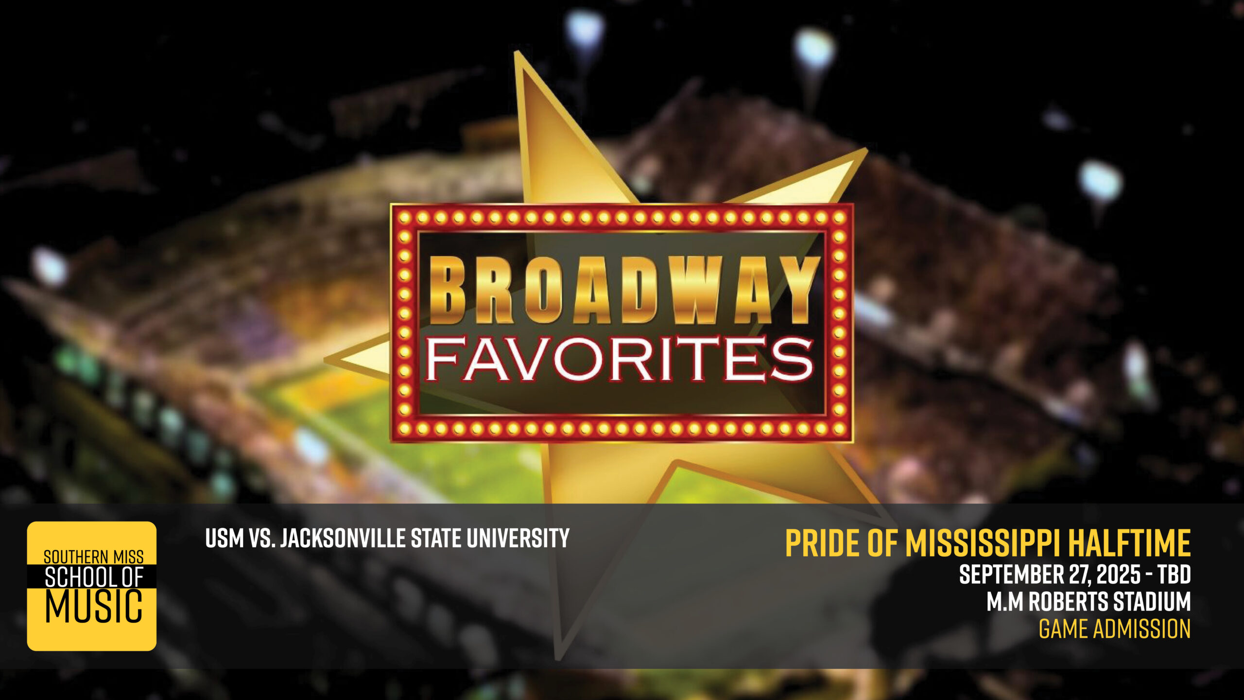 USM vs. Jacksonville State University Stay in your seats for the Pride of Mississippi’s halftime performance! We feature music from Broadway’s Hairspray, Hamilton and Wicked.